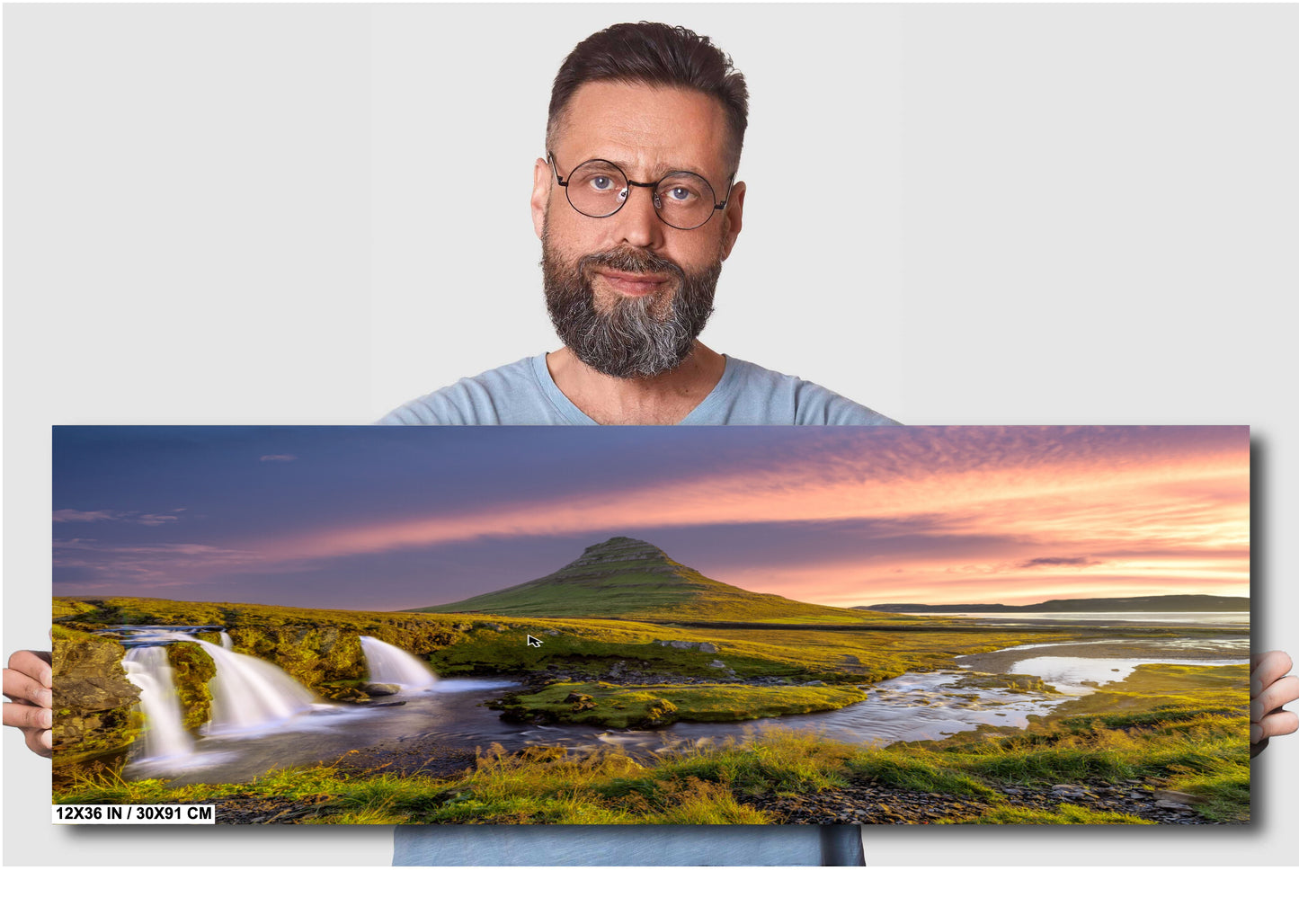The Kirkjufell Mountain Iceland fine art print captures one of Iceland’s most iconic natural landmarks. Soft light, flowing water, and balanced composition create a peaceful and dramatic scene. Because of its calm tones and striking structure, this artwork brings a sense of nature and clarity to any space. You can choose canvas, acrylic, or metal formats.